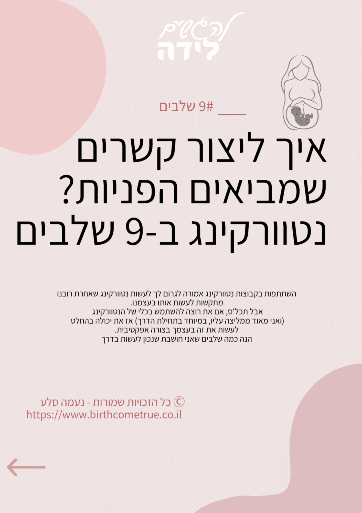 הורידי את החוברת החינמית הזאת כדי ללמוד איך ליצור קשרים שמביאים הפניות ב 9 שלבים ברורים, כך שתוכלי להתחיל לקבל פניות חדשות ולראות צמיחה בעסק כבר בשבועות הקרובים.